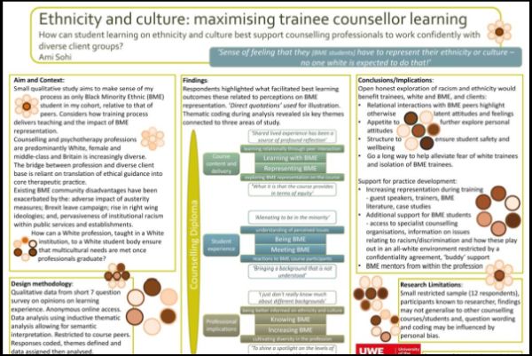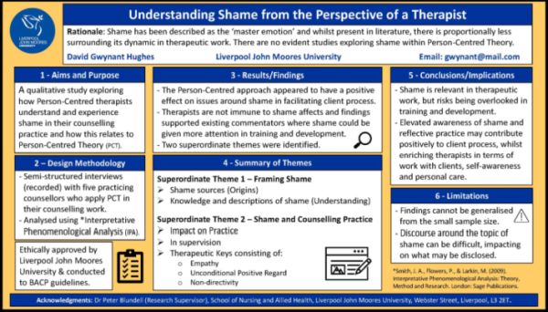 Poster presentations are an important aspect of our annual research conference and are often a researcher’s first experience of sharing their work at an event. Poster presentations can be a showcase for student work, though also include research undertaken at different levels of experience. All the content in this exhibition has been peer-reviewed for the BACP Research Conference 2020, where submissions need to demonstrate quality and relevance to practice.