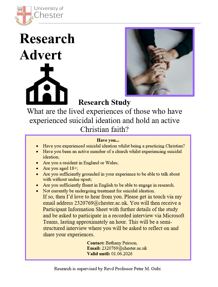 The aim of the study is to hear the voices of individuals who have experienced suicidal ideation whilst they were part of a Christian Church community. Some people experience church as a loving and supportive space for people who struggle with their mental health. But there can still be a perceived stigma of shame when it comes to experiencing suicidal ideation.