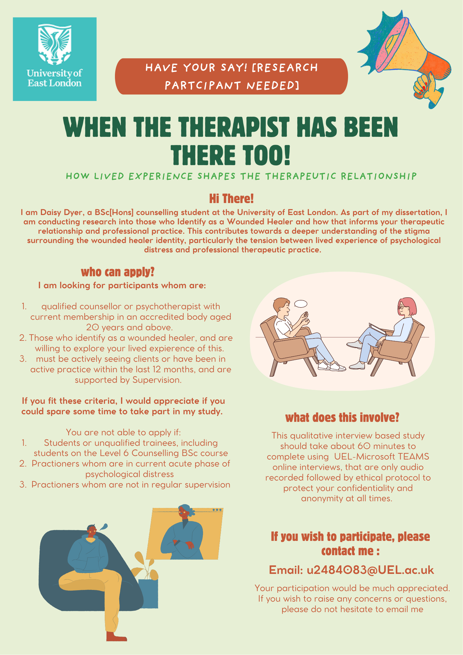 I am Daisy Dyer, a BSc[Hons] counselling student at the University of East London. As part of my dissertation, I am conducting research into those who Identify as a Wounded Healer and how that informs your therapeutic relationship and professional practice. Seeking to explore how counsellors personal experience of being a wounded healer may influence aspects within the therapeutic room, such as, empathy, client connection, potential vicarious trauma and the ability to engage in more complex therapeutic relationships. This contributes towards a deeper understanding of the stigma surrounding the wounded healer identity, particularly the tension between lived experience of psychological distress and professional therapeutic practice.