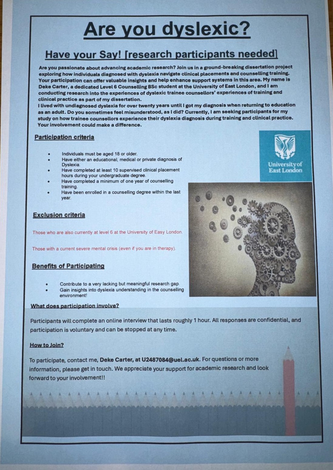I am looking for anyone with a formal diagnosis of dyslexia either still in training or have been in training within the last year and have completed a minimum of 10 placement hours.